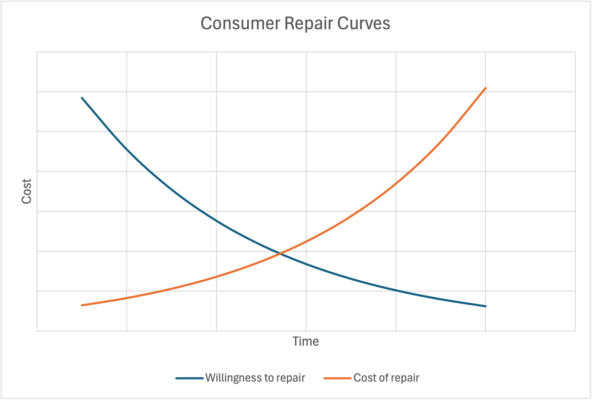Dr. Denizel studies e-waste and conducted a study of the interest/tolerance of consumers for the cost of repairs for cell phones and refrigerators. She found a common set of curves graphing the consumer willingness to pay for repair and the cost for repair, simplified here: