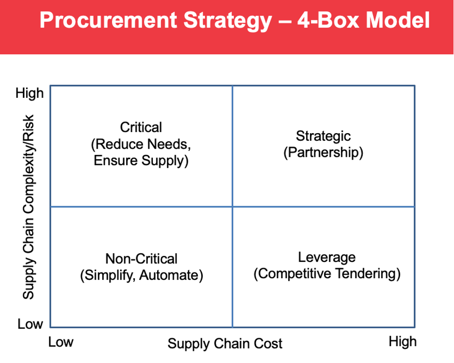 I once had a supervisor who was obsessed with what he called “the 4-box model” of procurement. His version graphed supply chain complexity/risk on the y-axis and supply chain cost on the x-axis, classifying suppliers into one of the four resulting quadrants. Low cost and low risk suppliers were Non-critical, low cost and high risk suppliers were Critical, high cost and low risk suppliers were Leverage, and high cost and high risk suppliers were Strategic. He was not a supply chain major and was two weeks into managing his first supply chain team. While he wasn’t too far off from one of the central principles of procurement, what he really wanted was a Kraljic Matrix. For today’s article, let’s talk about the differences between this “4-box model”, a Kraljic Matrix, and the Kearney Chessboard. More importantly, let’s talk about how to use them to improve supply chain value, how to present their data to executives, and why this tool from 1983 is still relevant today.