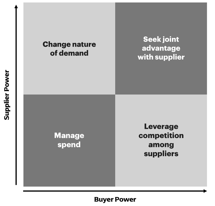 Now the Kearney Chessboard, also known as the Purchasing Chessboard, is similar to a Kraljic Matrix in that it centers on a 4-quadrant grid. It is also prescriptive in telling a procurement professional how to handle the supplier/category to maximize value. However, the x-axis in this case is buyer power and the y-axis is supplier power. With low buyer and supplier power, the recommendation is to simply manage the spend. With low buyer power but high supplier power, the recommendation is to change the nature of the demand, perhaps by bundling or breaking a purchased item into components with more competition available. With low supplier power but high buyer power, the recommendation is to leverage competition among suppliers (this is where Requests for Proposal and E-auctions thrive). Lastly, high buyer and supplier power lead to a need to partner with a supplier to seek joint advantage (like gainsharing or performance-based incentives).