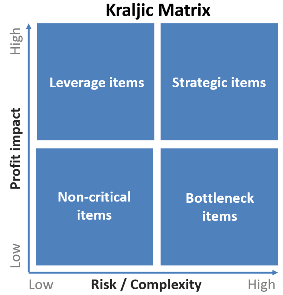 I confess I’m not sure where my former supervisor’s “4-box model” came from, although it does appear to be a slight modification on the Kraljic Matrix. The Kraljic Matrix was introduced by Peter Kraljic in 1983 in a Harvard Business Review article titled Purchasing Must Become Supply Management. His version looks more like this: